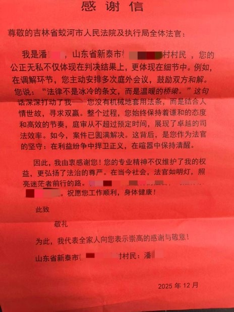 近日,蛟河市人民法院执行局收到一封来自山东新泰的感谢信。信中,当事人潘某写下了对承办法官的由衷感谢,也记录了一段跨越千里的抚养权纠纷如何在司法温情中得以化解。