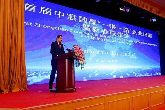 尼加拉瓜参赞温贝托·克拉多、波斯尼亚和黑塞哥维那大使西泥沙·贝尔扬等分别讲话,介绍了“一带一路”建设对世界经济发展的积极成果。温贝托·克拉多向中宸国赢集团董事局主席张语洛女士颁发荣誉奖证书,表彰其在推动“一带一路”产业出海中的突出贡献。